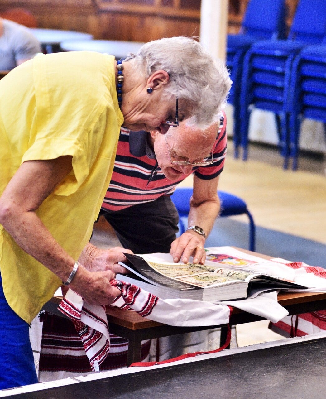 The talk moved across regions of Ukraine, tracing shifts in colour, density and symbolism. The striking black embroidery of the Borshchiv tradition drew particular interest, its bold surfaces carrying stories of mourning, resilience and local identity. A small display of authentic rushnyky — ritual cloths used in family and community ceremonies — brought the discussion off the page and into the room. Their presence changed the atmosphere; these were not museum pieces behind glass, but textiles that had lived.